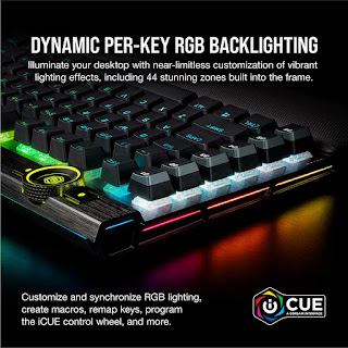 CORSAIR AXON Hyper-Processing Technology enables CORSAIR's most advanced gaming keyboard experience by delivering your keypress inputs up to 8x faster with 8,000Hz hyper-polling and 4,000Hz key scanning, while simultaneously driving 20-layer lighting effects.LINEAR & FASTCHERRY MX SPEED Silver keys witches provide lightning fast response times with an extremely short actuation distance of just 1.2mm, perfect for fast-paced competitive gameplay. STAY IN CONTROLTake command over backlighting, media jogging, and more with a multi-function ICUE control wheel, fully programmable to perform custom actions in games and applications. MACRO CONTROLGain an in-game advantage with six dedicated macro keys, fully programmable for complex macros and key remaps in ICUE software, or program special streaming commands through Elgato Stream Deck software. r |